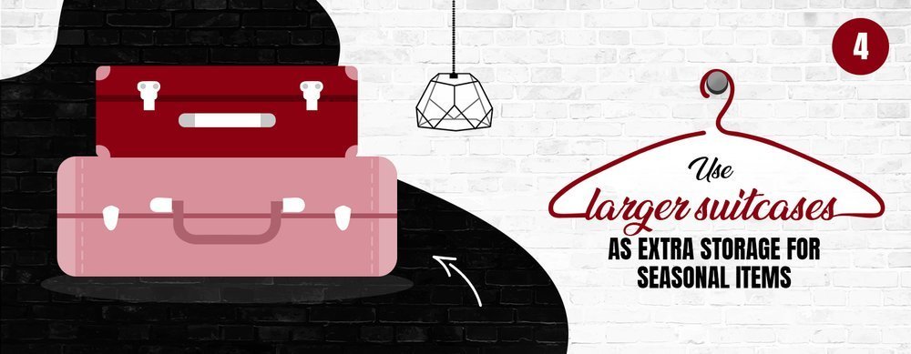 If you have a smaller closet and decluttering isn't enough, you need to think of clever ways to create more storage space. One trick is to use larger suitcases to store items you don’t necessarily need daily. It’s ideal for off-season clothes, especially those bulky, cold-weather items you won’t be wearing in warmer months, or resort wear and other travel items you might not need right away. You can also use rolling storage bins that fit under your bed so your closet will have more space for the part of your wardrobe you're wearing regularly.